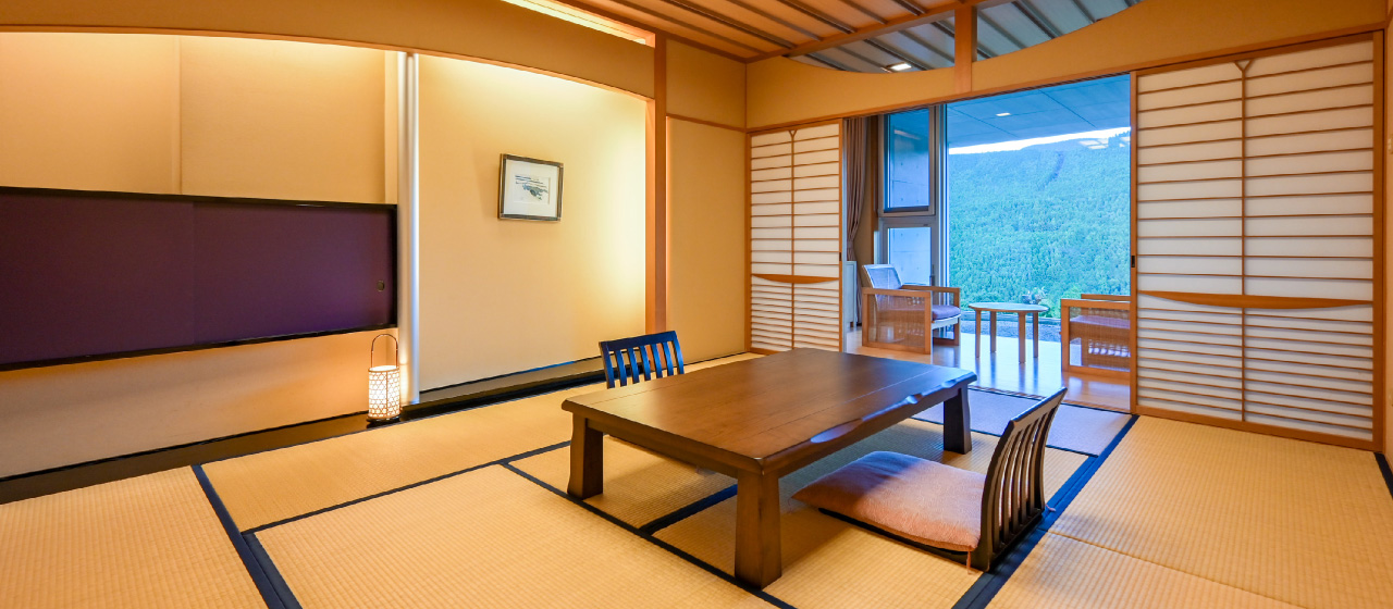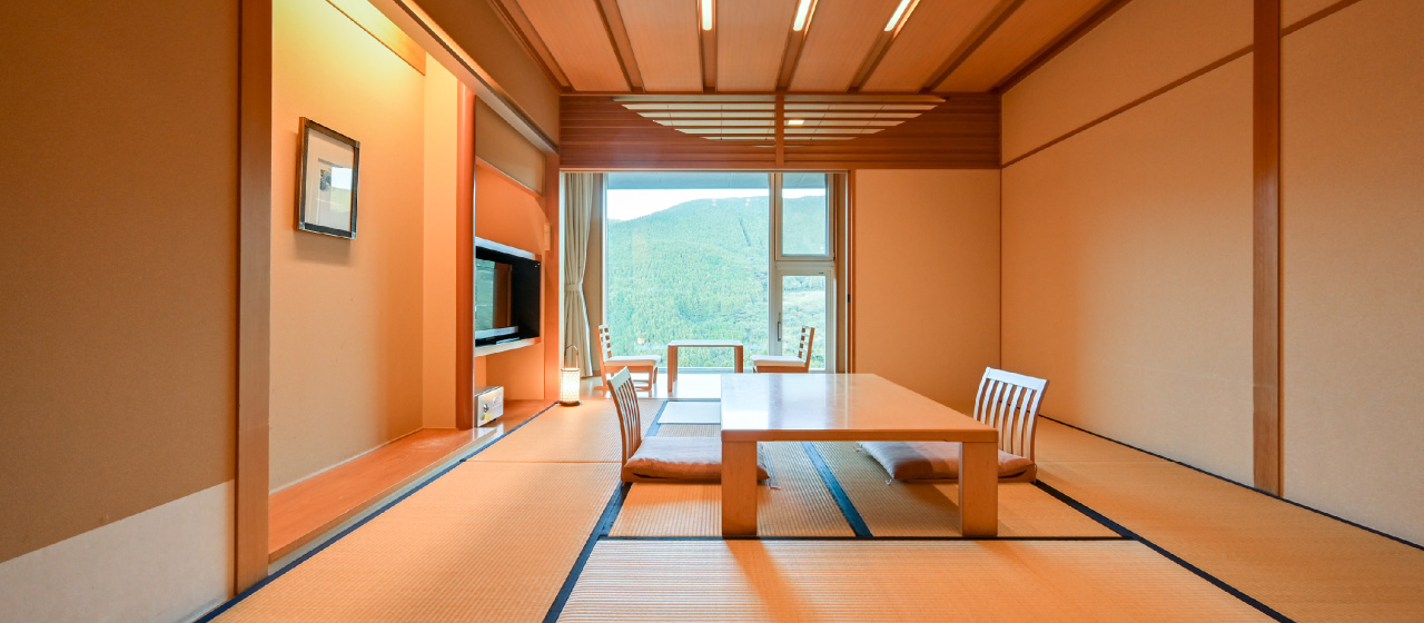 和室、洋室ともにお部屋からは美しい山々を望めます。バリアフリーのお部屋もご用意しております。