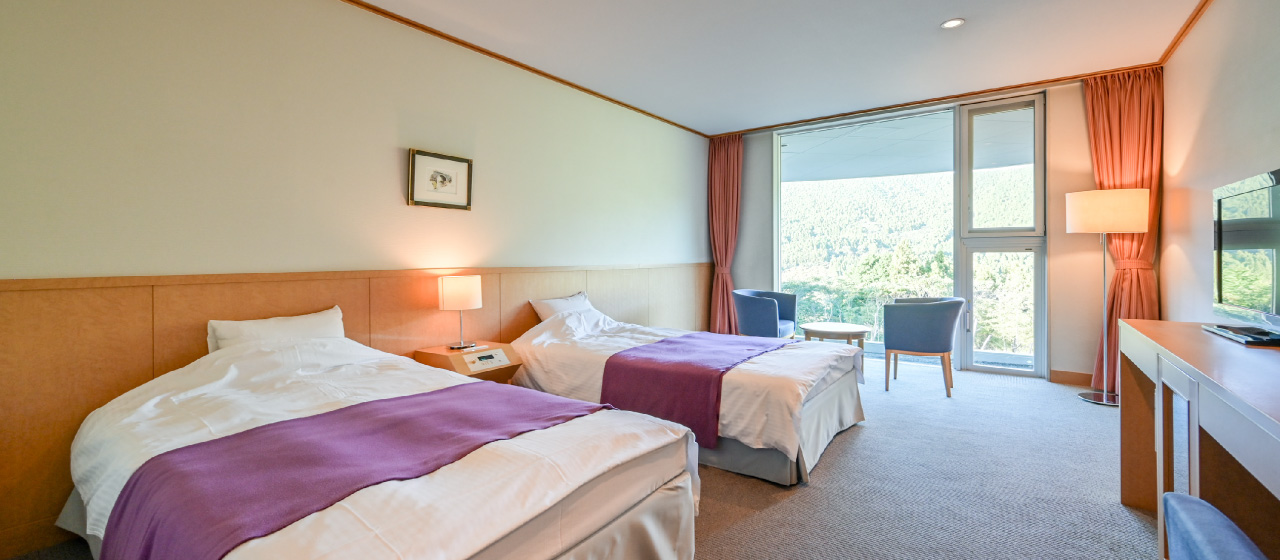 窓から緑一面を望む客室面積35㎡の客室です。3名様の場合はエキストラベッドを1台ご利用いただきます。