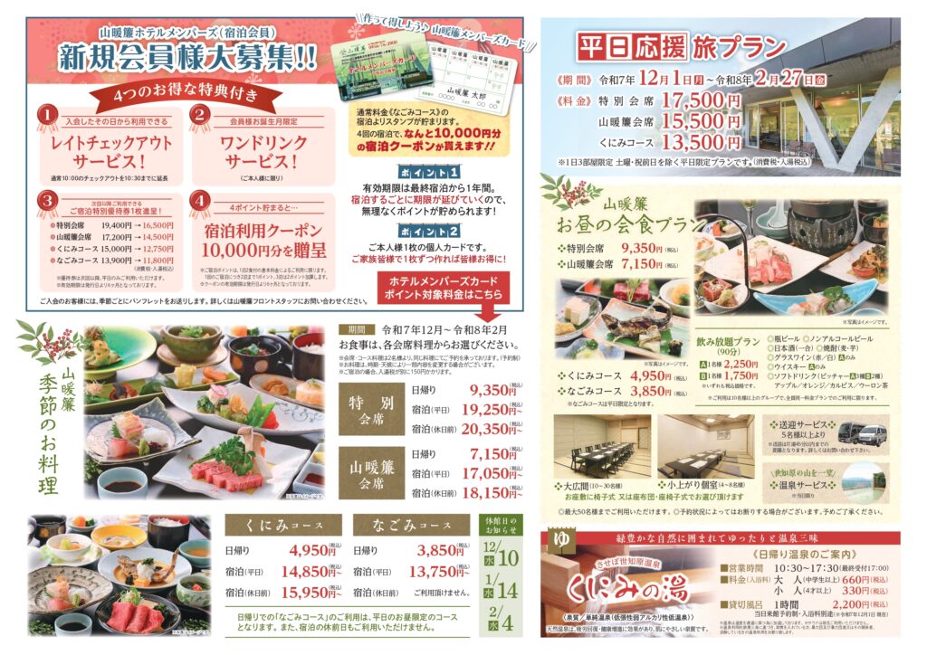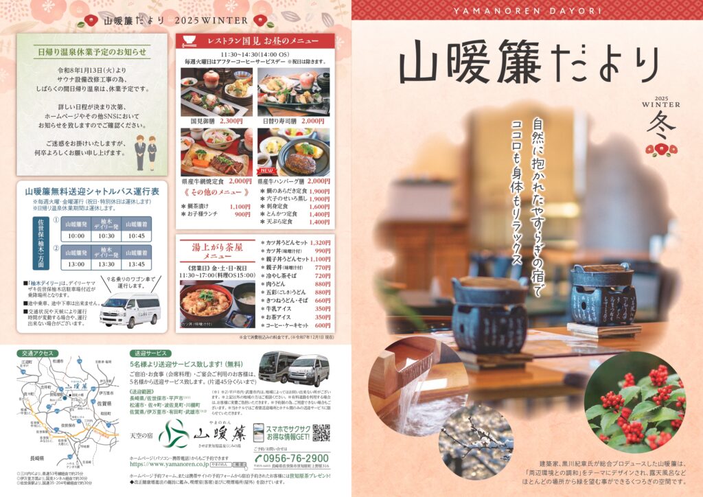 山暖簾からのお知らせをご覧いただけます お知らせをはじめとした最新情報、季節ごとに発行しております季刊誌「山暖簾だより」、宴会・法事・法宴「日帰り利用」など季節の情報をお届けいたします。 すべて お知らせ 山暖簾だより 日帰り利用 温泉イベントカレンダー 温泉営業時間・休館日のお知らせ 過去の献立 2025.11.26山暖簾だより 山暖簾だより 2025年WINTER12~2月 季節ごとに発行しております季刊誌「山暖簾だより」です。 最新の情報をご覧いただけます。 PDFで詳しく見る Back Next 記事一覧