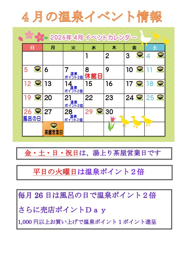 山暖簾からのお知らせをご覧いただけます お知らせをはじめとした最新情報、季節ごとに発行しております季刊誌「山暖簾だより」、宴会・法事・法宴「日帰り利用」など季節の情報をお届けいたします。 すべて お知らせ 山暖簾だより 日帰り利用 温泉イベントカレンダー 温泉営業時間・休館日のお知らせ 過去の献立 2026.03.29温泉イベントカレンダー 4月のイベントカレンダー PDFで詳しく見る Back 記事一覧