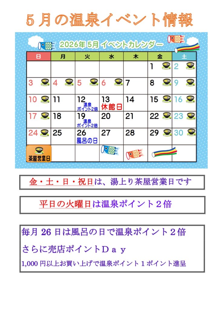 山暖簾からのお知らせをご覧いただけます お知らせをはじめとした最新情報、季節ごとに発行しております季刊誌「山暖簾だより」、宴会・法事・法宴「日帰り利用」など季節の情報をお届けいたします。 すべて お知らせ 山暖簾だより 日帰り利用 温泉イベントカレンダー 温泉営業時間・休館日のお知らせ 過去の献立 2026.04.28温泉イベントカレンダー 5月のイベントカレンダー PDFで詳しく見る Back 記事一覧